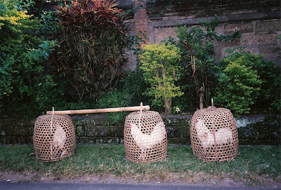 In Bali cockfighting is illegal, except for religious ceremonial purposes that require an animal sacrifice. But the traditional gambling sport is still so popular that it continues to be carried on discretely. Raising fowl is not illegal, so the cocks are not kept hidden. In fact, the roadsides are lined with rows of guungan siap, cock baskets shaped like bee hives, woven from bamboo strips in a hexagonal pattern. The owners take good care of their birds, providing water and special feed, and regularly moving the cages from sun to shade and back. The reason for placing the cages near a road is to get the cocks used to noise, movement and people, so that when they are put in the fighting arena they will not run away. Several villages specialize in making cock baskets, both the large cages and the smaller baskets for carrying the cock under the arm to a fight.